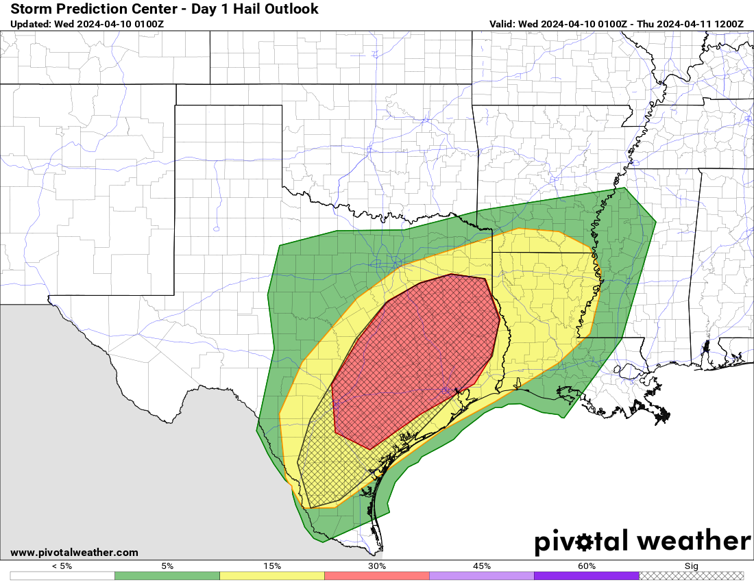 The latest HRRR, showing an ugly MCS with hail cores.Storms may start forming as early as midnight in some areas. As the frontal boundary moves into SE Texas and merges with the potent disturbance coming out of Mexico along the subtropical jet.