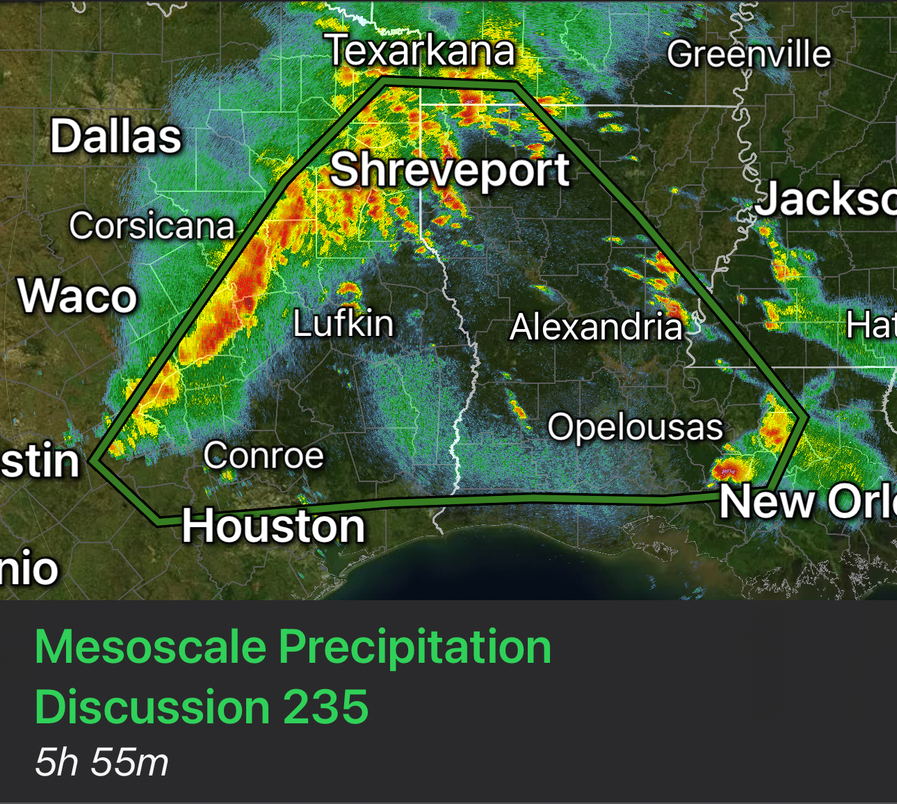 Recent HRRR runs support the potential for hourly rates up to 3 inches and 5 inch totals, with the 12z HREF highlighting widespread 20-50% chances for 3-hrly totals greater than 3 inches in the MPD area. Although, the HRRR has been developing too much leading convection compared to current radar data. Outside of the eastern extent of the Texas Triangle, where 3-hrly FFGs are under 3 inches, much of LA does have elevated FFG that could inhibit the initial impacts of heavy rainfall. However, for southern sections of LA along the warm front, thunderstorms are anticipated to remain less progressive and oriented more west-east (similar to the mean wind) by this evening. Current convection near Baton Rouge shows this potential for slow-moving warm frontal storms that may continue and congeal with the approaching line. Scattered flash flooding is likely within this area, with greatest potential for significant impacts where convection is slower to progress on the southern flank from east-central TX through central LA.