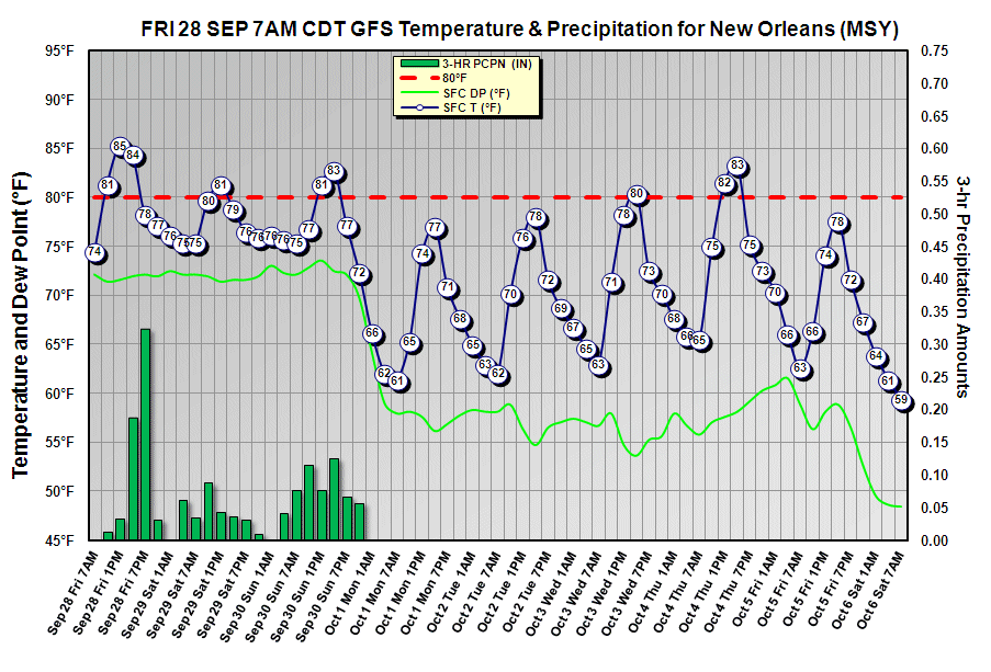 Latest GFS indicates that the heavier rain will pass north of New Orleans. Light rain indicated from this evening through Sunday evening. Total precip only an inch or so. Waiting on 12Z Euro to see if it is in agreement. See below: