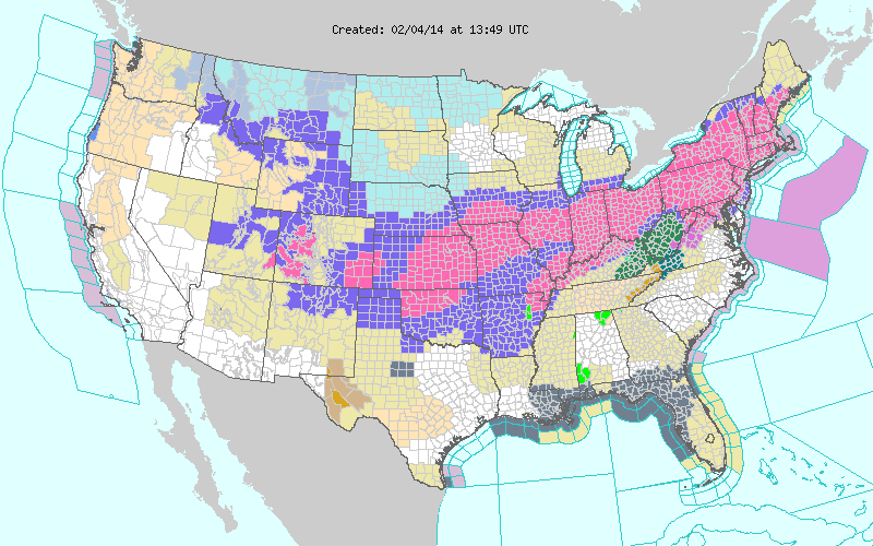 A significant Winter Storm is underway across the Plains on E into the Mid West/Greats Lakes and New England. Heavy snow is falling across portions of the Southern/Central Rockies as a Pacific origin upper low treks ENE along the Polar boundary. Various Winter Storm Warnings and Advisories are in affect for a large portion of the Eastern half of the CONUS.