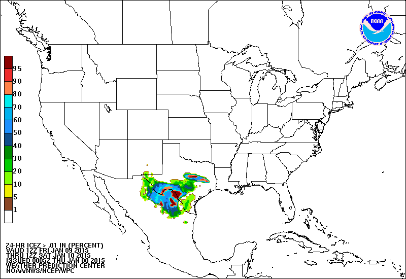 29F right now here in NW Harris County. The only real change I can see from over night is the freezing rain chances were introduced a bit further to the SW near and N of Corpus Christi. Both NWS CRP and HGX issued Special Weather Statements regarding two chances of wintry weather precipitation wise. One is with the second Arctic front tomorrow and the next chance would be Saturday night. Here are the morning discussions from the Weather Prediction Center and the graphics. Jeff sent out an briefing last night stating the he believed the graphics were "overdone", so be advised a lot of caution is being given before biting off on a solution that may bring wintry mischief across our Region including the Hill Country.