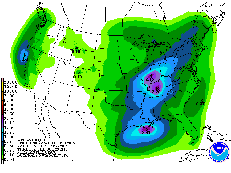 I am really concerned along a NE to SW axis centered over the DFW region. GFS continues to paint that area with a multiple day training event. 2 inch Pwats associated with a deep moisture fetch from both Patricia and the gulf along with a series of shortwaves rotating though. This adds up to a classic training event. Closer to home, the designation of a coastal low looks more likely, but again it is all about location, location, location. Could see a strong gradient between the coastal low and the trough centered over North Texas. If that is the case, I would suspect the WPC's QPF map will be fairly accurate.