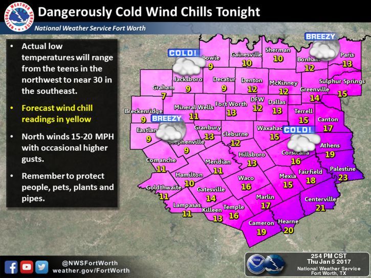 Wind chills this evening will lower into the 1’s and 10’s across the region as temperatures fall into the 20’s and wind remain in the 10-20mph range. Currently expecting wind chills between 9-13 at College Station and 16-21 across Houston. Wind chills from Columbus to Huntsville and NW this evening and overnight will be getting into dangerous levels and persons should limit time outside and completely cover all skin.