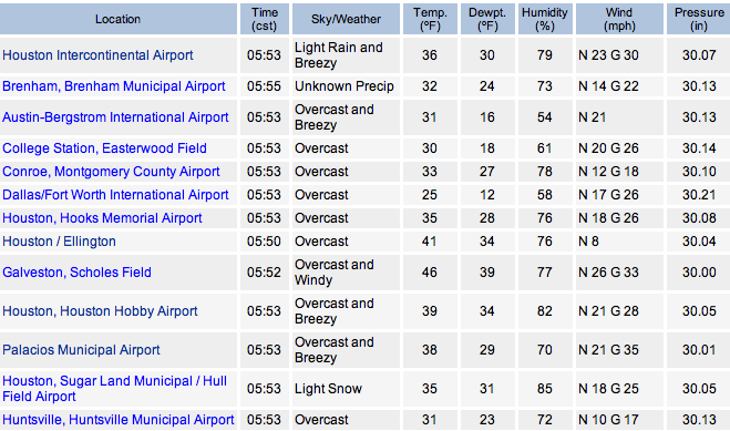 Temps here in the Austin area are colder than predicted. Today's high may not exceed freezing.