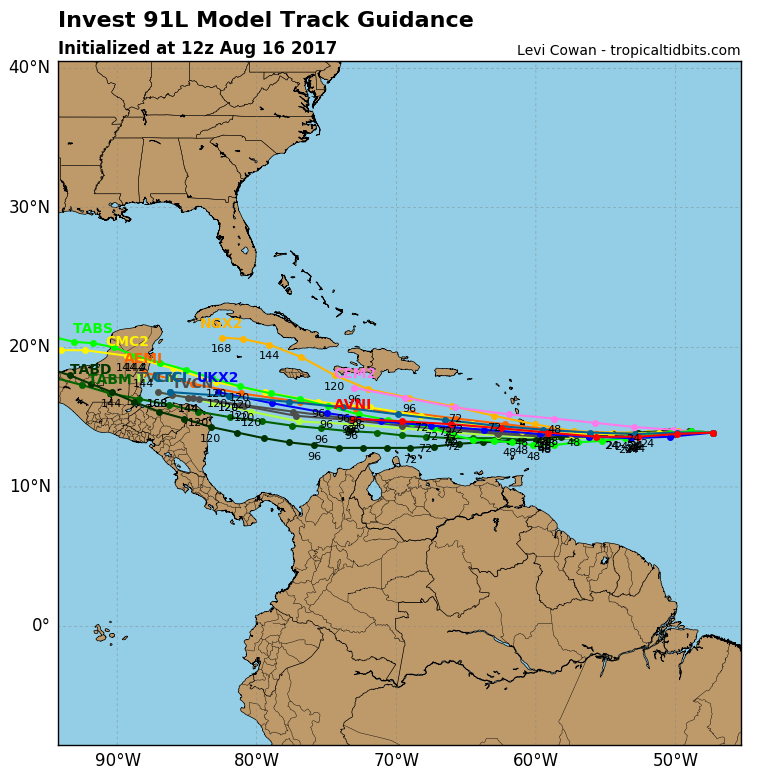 A quick Update regarding INVEST 91L. The Statistical and Dynamical Guidance have been trending a bit stronger for this disturbance, particularly as it nears the NW Caribbean Sea. CARCAH and the National Hurricane Center have begun tasking Reconnaissance Missions flying out of St. Croix to investigate the tropical disturbance as it approaches the Caribbean Islands. While it lacks deep tropical showers and thunderstorms, 91L definitely has a low level circulation clearly visible on Satellite Imagery.