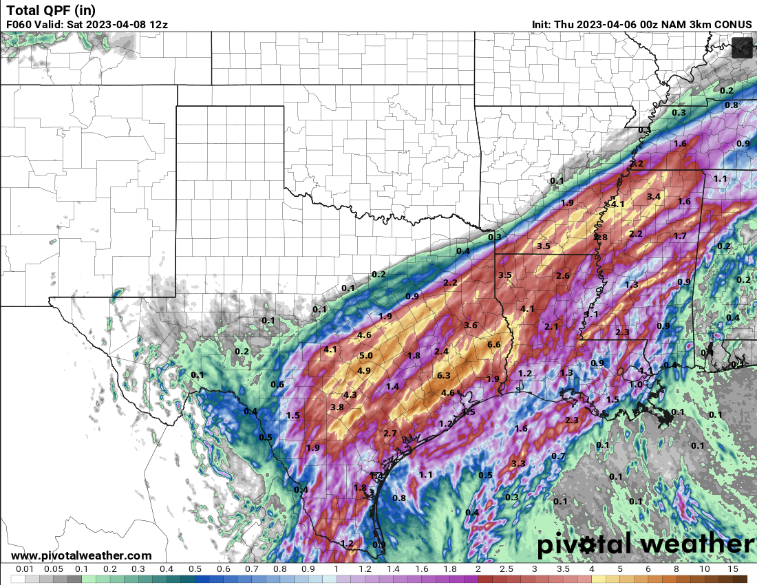 About 1/2” but the hail just missed us then hit our relatives up in the jersey village area. Curious to see how the low takes over (if it does) down in S. Texas. That would bring us steady rains we need.Cpv17 wrote: ↑Wed Apr 05, 2023 9:55 pmHave y’all gotten anything yet? I still haven’t had much here.davidiowx wrote: ↑Wed Apr 05, 2023 9:44 pmSure if you’re looking at precip accum 12-18 hours into the run. Total precip 24+ hours out is a roll of the dice in these set ups. Lots will change overnight. This has a classic training set up across the coast (or further N) with outflow north as the wind shifts. Models may or may not have picked it up yet. No real way to say one way or the other, but just wait and see. Tomorrow will shed more light on what’s going on.Stratton20 wrote: ↑Wed Apr 05, 2023 9:17 pm 00z HRRR is the worst case scenario for you coastal and sw county folks, basically keeps the heaviest totals offshore on this run, but that line that just trains over the open water would essentially cut off moist flow, effectively preventing convection, thats why rain fall totals for those areas are way lower on this run