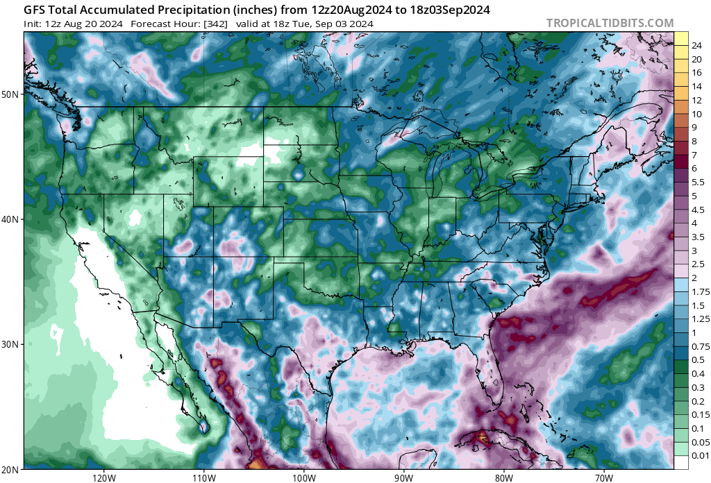 Let's hope it holds up.Stratton20 wrote: ↑Mon Aug 19, 2024 6:11 pm GFS has a pretty wet pattern becoming established next week and beyond that, bring it! Daily chances for some needed rain, persistent easterly flow on the GFS, lets just hope that doesn’t involve a tropical system