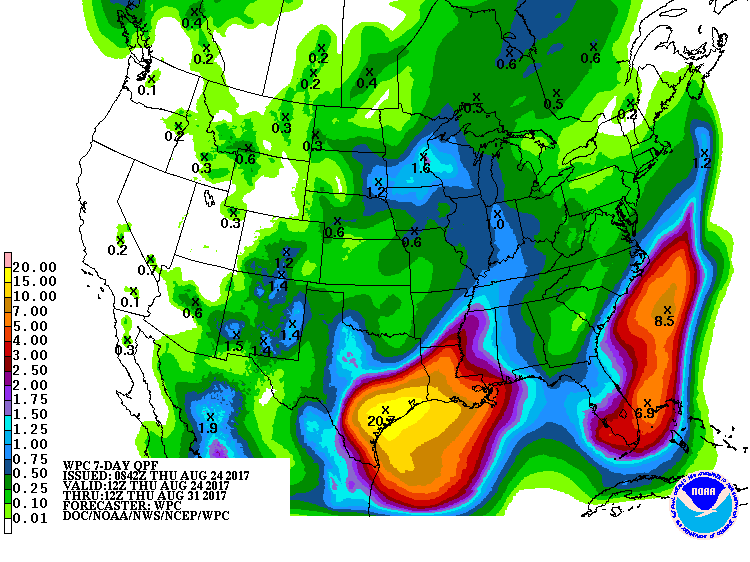 Conditions appear favorable for intensification of Harvey up to landfall on the TX coast. All parameters appear to be satisfied including warm SST’s, 200mb high pressure over the center of the system, potential dual outflow channels to the NE and SW of the center. It is possible that a period of rapid intensification could occur as Harvey nears the middle TX coast on Friday. Intensity forecast skills are poor especially when dealing with rapid intensification…this aspect will need to be monitored closely over on Thursday and Friday as Harvey approaches. Current coordinated NHC/WPC positions bring s minimal hurricane into the coast in the reach between Corpus and Port O Connor Friday evening.