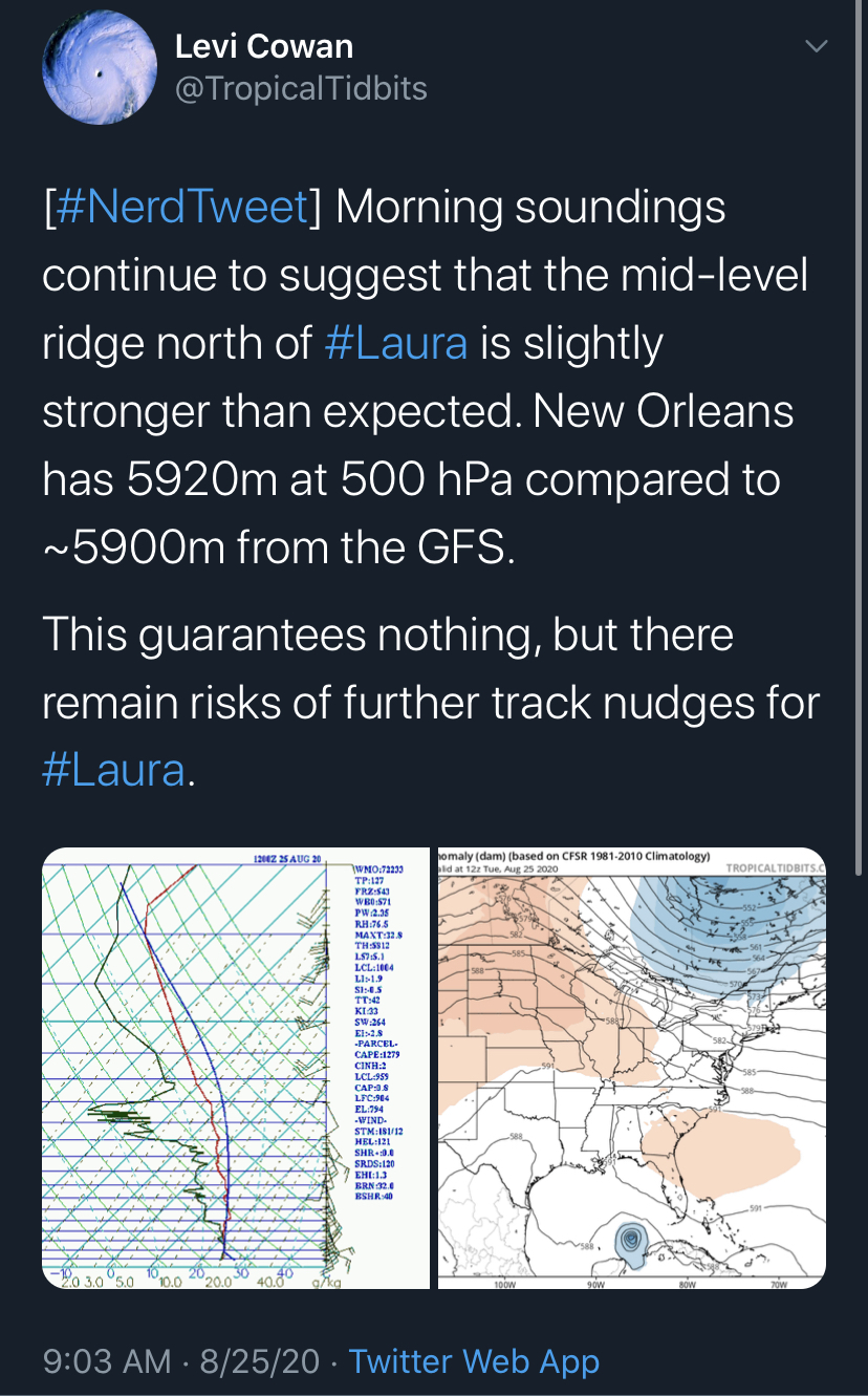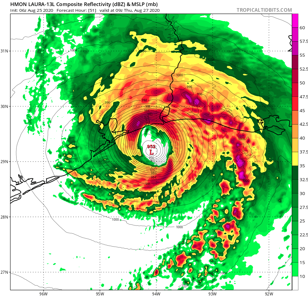 First center pass of NOAA RECON suggests Laura continues to strengthen. Estimated Extrapolated 992mb.