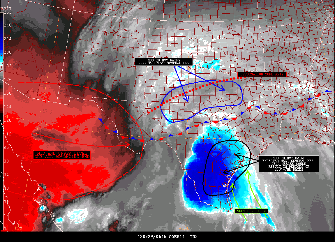 It appears the Canadian may well be the winner of the various model solutions over the past 24 hours regarding how events will unfold today across Central/SE Texas as EPAC Miriam and Norman remnants spread NE from Mexico. The Canadian has been more correct in suggesting S Central TX would be the area to watch and now the 00Z UKMet has joined that solution. Areas S of San Antonio has seen rounds of stronger storms and Flash Flood Warnings as well as a Severe Thunderstorm Warning since 1AM. It appears a meso low will move NE along the HWY 59 Corridor and pass directly over the Houston Metro tonight/early Sunday morning. Heavy showers/storms continue to develop near and to the W of Victoria heading N while the meso low and developing surface low pressure moves NE. The HPC 1-2 Day QPF Forecast just issued now places along and N of HWY 59 in the 'favored' area with some 5+ inch isolated rainfall totals. The latest SPC Updated also suggests that stronger storms with gusty winds are not out of the question as well. Some rainfall rates in the 1-3 inch per hour range may not be out of the question and we'll need to monitor for training cells as the flow off the Gulf increases this morning ahead of the advancing surface low to our S and W. It does appear as if everyone in SE TX will see some rainfall from this event before the surface low and upper low over W Texas passes us off to the E tomorrow ending our rain chances as we end September.