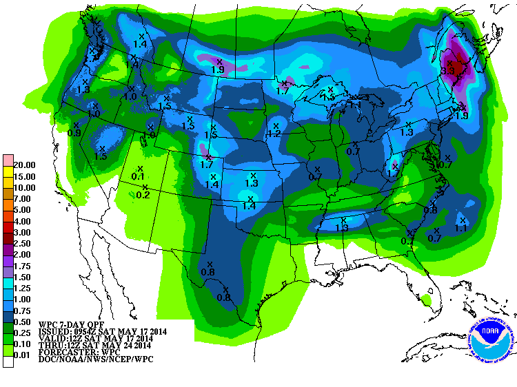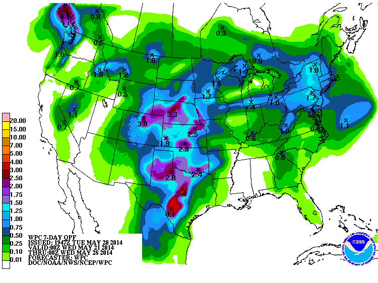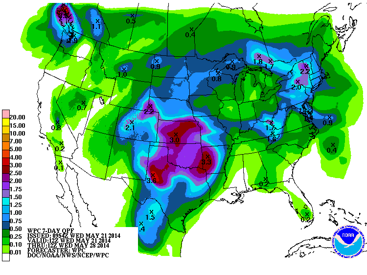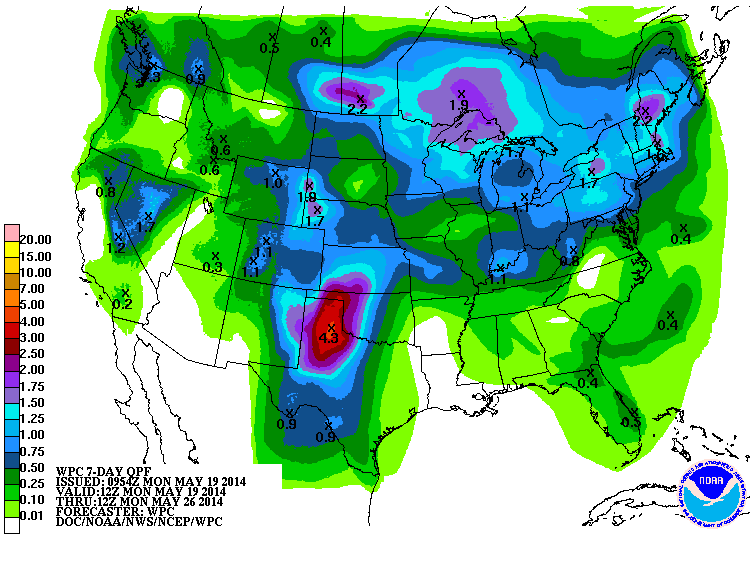 The trend of below normal temperatures continue for Mid May. The good news for our neighbors in NW Texas and Western Oklahoma where an exceptional drought is ongoing, and the chances of increasing rainfall as the Western trough hangs up and ushers in moisture rounding the W side of the Gulf of Mexico Upper Ridge and some unsettled weather in the Eastern Pacific as we head into the late next week timeframe and the Memorial Day long weekend.