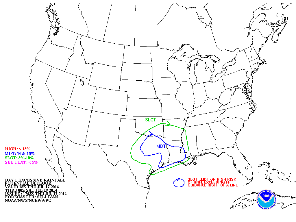 The Weather Prediction Center places a rather large Moderate Risk for Excessive Rainfall across portions of NE/E/SE Texas as well as much of Southern Louisiana.