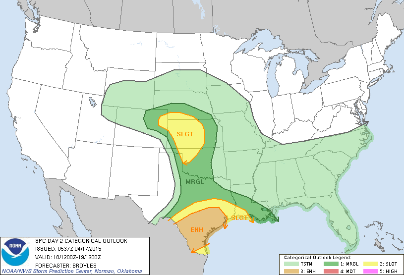 The heaviest rains fell E of Houston metro where 4-8" of rain fell last night. Harris County received 2.5-3.5" across the SW portion of the county while areas E of downtown Houston saw up to 5.25". The potential exist for significant flooding and severe weather through Saturday. The SPC has an enhanced risk for S and SE TX today and Saturday. A Flash Flood Watch remains in effect for all of SE TX through Saturday with some areas receiving an additional 3-6". Later this afternoon and overnight will bring a significant severe weather threat as models indicate a mesoscale convective system developing across W portions of SE TX which will move across the Houston-Galveston areas. Be weather aware today.