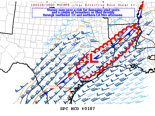Latest surface analysis as of 1620Z from the WPC suggests a surface low is just WNW of San Antonio with a trough axis out ahead of the frontal boundary roughly from San Antonio to Brenham/Huntsville and Lake Livingston. Another surface low is just N of Monterrey in Mexico with yet another trough axis extending to the tail end of the front along the Rio Grande River. I am a bit concerned about the rather abundant sunshine down near Victoria on E into our SW Zones. I also see some indications of possible gravity waves attempting to develop W and S of Corpus Christi. Gravity waves can sometimes be precursors of supercell development in the next several hours.