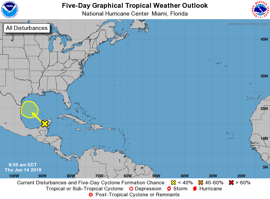 Tropical feature over the western Caribbean Sea will move into the southern Gulf of Mexico on Friday and the western Gulf of Mexico on Saturday. Development of this system appears to be low due to strong wind shear over the Gulf of Mexico, but this wind shear will be weakening this weekend so this system will need to be monitored for any attempts at development over the weekend. The NHC currently places the 5 days development chances at 10%.