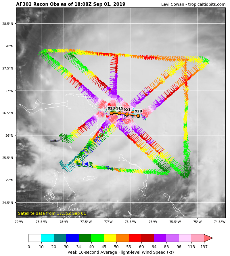 USAF planes have been continuously inside the eye of Dorian this morning and the central pressure has fallen from 925mb to 907mb and the winds increasing from 160mph to 185mph sustained. Frequent dropsounde observations in the eyewall of Dorian have recorded 200-220mph winds near the surface and it is very likely that the islands in the northern Bahamas will see frequent wind gust over 200mph. Storm surge flooding of 15-20 feet is likely over the islands today.