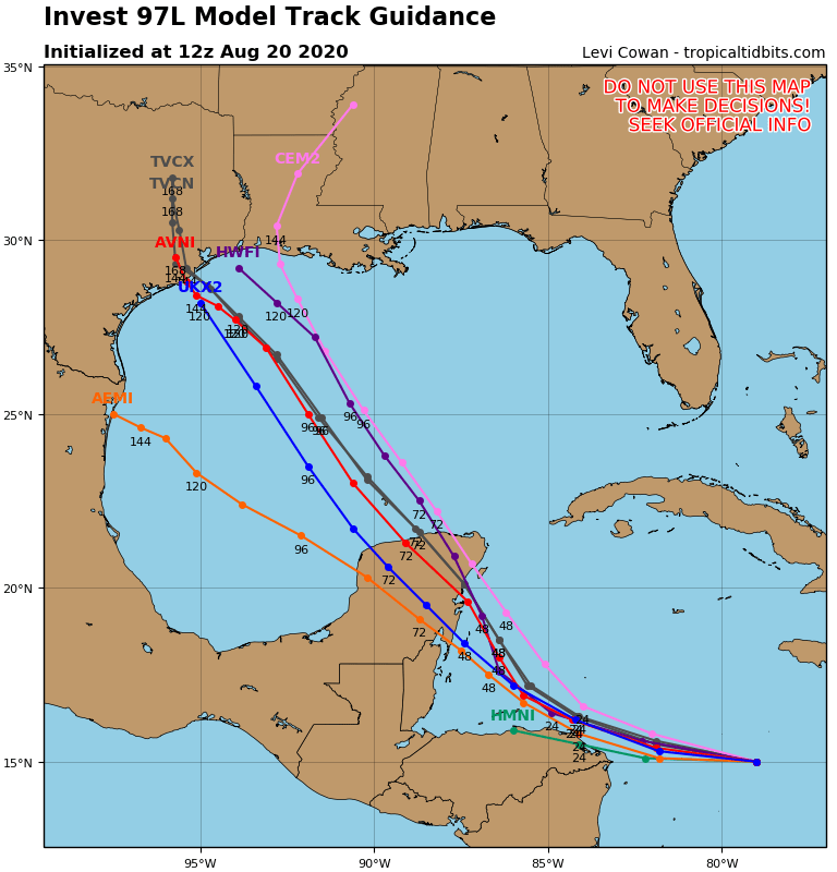 Yeah and wow - moving towards that NAVGEM solution.srainhoutx wrote: ↑Thu Aug 20, 2020 9:16 am 97L looks to have become better organized overnight. I suspect we will have a TD or possibly a TS on our hands when RECON investigates today. The 12Z track guidance does raise an eyebrow.