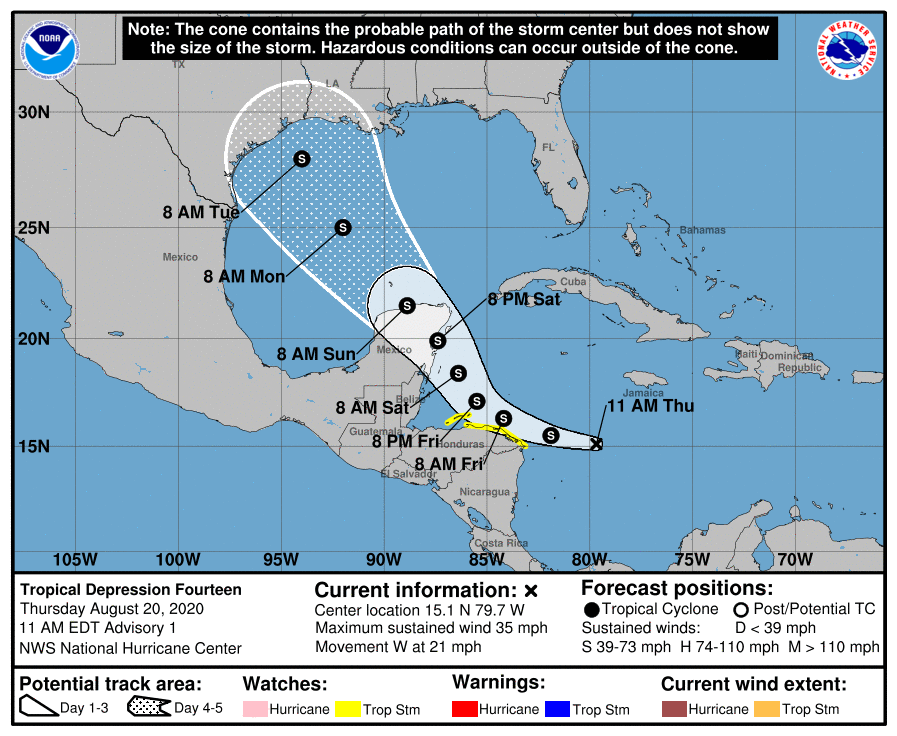 srainhoutx any thoughts on the initial track of td14.srainhoutx wrote: ↑Thu Aug 20, 2020 9:41 am Tropical Depression 14 forms in the Western Caribbean Sea.