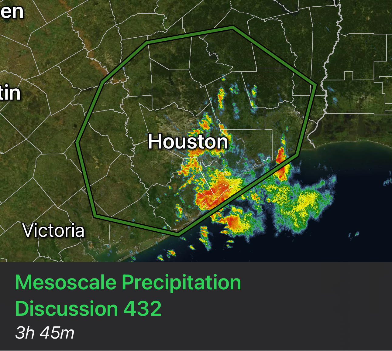 Discussion..Convection that had initially formed over along and just offshore of the Texas coast has matured and formed a westward-moving cold pool that currently extends from near Downtown Houston southward to Lake Jackson. The storms are ingesting air from a very buoyant, weakly capped pre-convective environment (3000 J/kg MLCAPE, 2 inch PW). This moisture-rich environment and weak shear has fostered development of slow-moving, outflow dominant convection to materialize with spots of 2 inch/hr rain rates recently observed near Galveston and League City.