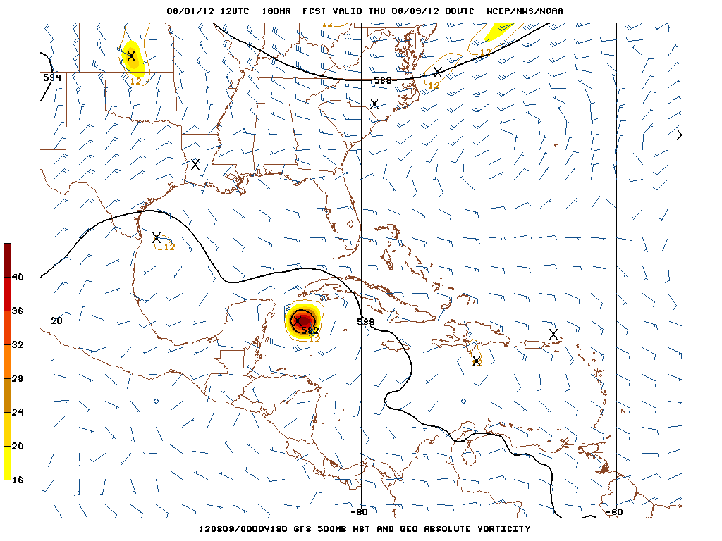 It is a bit interesting to see the 12Z GFS 'sniffing' conditions a bit more conducive for development once 99L enters the NW Caribbean. The disturbance is becoming vertically stacked via the GFS and strengthening rather quickly as it near the Yucatan Channel...