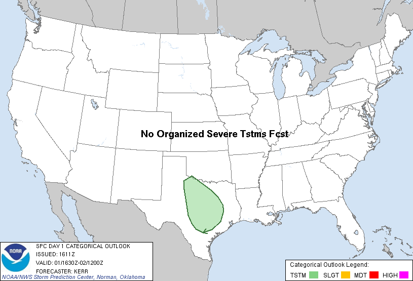 We have light frost up here in NW Harris County this morning. The feature outlined by the SPC for today for locations across Southern Oklahoma and North Central Texas is what is creating the fuss about this potential snow flurry/ice pellet talk that we have been mentioning all week. We will see what the radar suggests later today to see if there is anything to this novelty potential that HGX has been talking about all week.