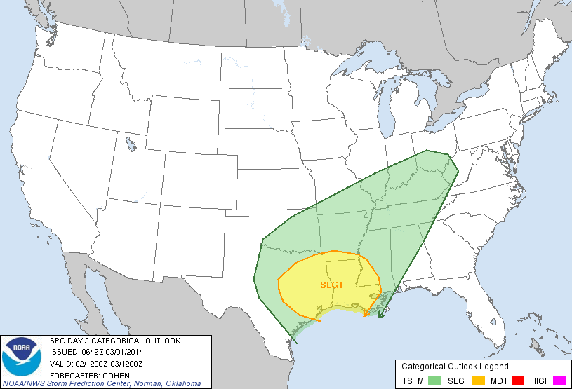 [quote="srainhoutx"]A potent storm system currently offshore of California will advance inland on Saturday as it treks E on Sunday ahead of a deepening Central/Eastern US trough setting the stage for a potential severe weather episode on Sunday basically from Austin on E across SE and E Texas mainly N of I-10 where there are growing indications the capping inversion will erode. A very strong RRQ 110kt jet could allow for strong to severe storms to develop and quickly shift E into Louisiana Sunday afternoon/evening as a strong Polar front drops S. The Storm Prediction Center has placed a Day 3 Slight Risk for Severe Storms across potions of the Eastern half of Texas extending E into Louisiana to around Baton Rogue. The primary threat appears to be damaging straight line winds with some hail and a possible quick spin up of a tornado or two with the veering winds aloft.