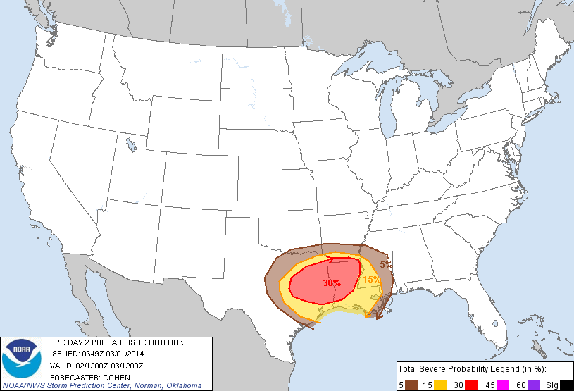 Latest from the SPC. 30% hatched area moved S to Houston metro for tomorrow: