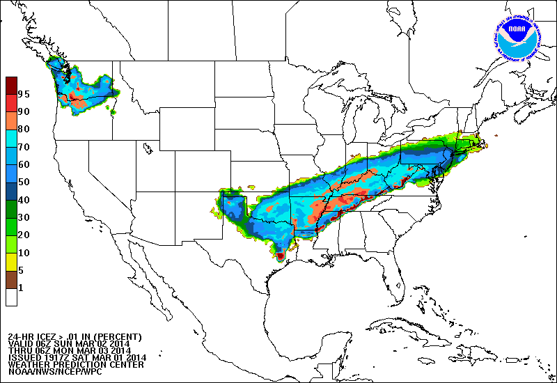 As is very typical with Pacific storms systems the overnight guidance continues to struggle with the severe dynamics and the 00Z suite of both meso (short range) and global operational computer models have shifted the severe threat further NE across basically the Lake Livingston area toward Lufkin and on NE toward Shreveport. Capping issues appear to erode Sunday afternoon, but the more favorable dynamics have shifted further NE. The SPC has expanded the Slight Risk area a bit further W and also N and extended the Eastern flank slightly. My hunch with the powerful storm system just now reaching the Central California Pacific Coast is that we may see a strong line of storms as the front sweeps across our Region and that could lead to some isolated straight line wind issues. We will see what the day brings, but I did notice some wild weather videos from California last evening as waves of heavy rains and flash flooding were creating problems as far S as the Los Angeles Metro area as the storm system was still well offshore and sending waves of storms and heavy rainfall inland. The storm complex doesn't appear as tightly wrapped up this morning as it did yesterday, but is send abundant Pacific moisture across the Desert SW and on E towards the Central and Southern Rockies. A large chunk of real estate in the cold sector is going to see on heck of an ice storm extending E into the Mid Mississippi and Ohio Valley Region and even further E along the Atlantic Coast I-95 Corridor on Monday. I wouldn't be surprised to see significant air travel delays on Monday across a large portion of the Eastern half of the US.