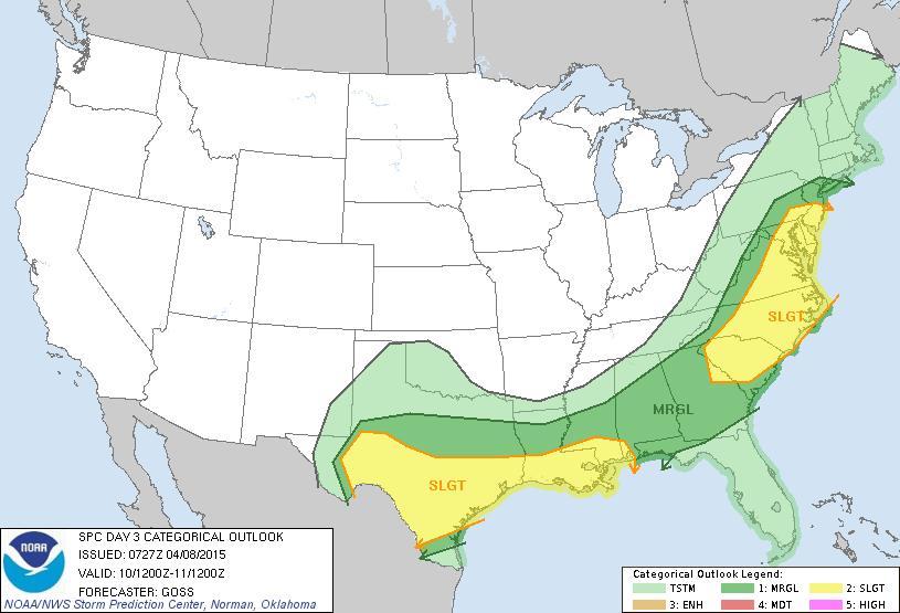 As Andrew pointed out, the parameters for potentially strong to severe storms are slowing increasing particularly during the Thursday night into Friday timeframe. The latest guidance suggests that an uncapped atmosphere with a rather impressive jet streak out of the Eastern Pacific crossing Mexico into Texas and Louisiana could develop with veering winds as well as a lower level increasing flow off the Western Gulf combining with a very moist and unstable airmass along and S of the stalled front typically spells an active weather pattern. The Storm Prediction Center has issued a Slight Risk for Severe Storms Thursday night into Friday with damaging wind and hail being the primary threat at this time.