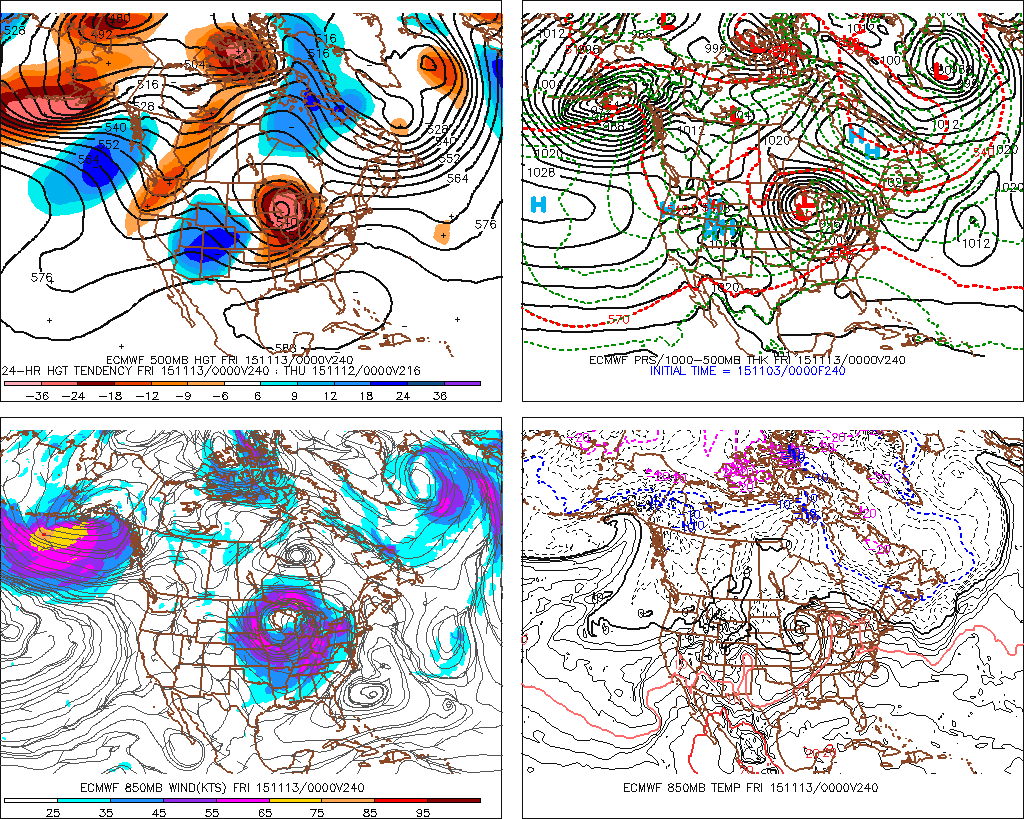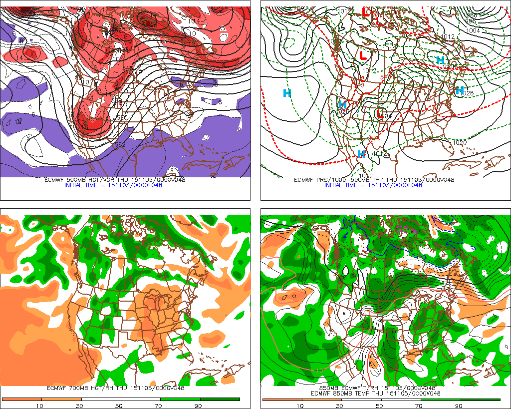 The 00Z GFS is still a bit too progressive in shifting the upper Western trough and frontal boundary East. The European suggests the Western trough with embedded upper air disturbances as well as the front will be slower and stalling S of the I-35 Corridor. Think the European model has the best handle on the upper pattern at this time. Strong to possibly severe storms should organise Wednesday night into early Thursday to our West and slowly advance S and E into Friday. Meanwhile back across the Great Basin into the higher terrain of the Rockies, the first significant snow fall of the season looks likely. A harbinger of things to come as we move deeper into November.