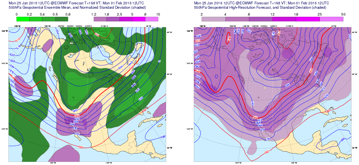 The 12Z ECMWF Ensembles are suggesting a lot of spread among the various 50+ ensemble members regarding a deep Western trough versus the operational guidance which is less amplified. It will be interesting to see if this indicator persists for an early February Winter Storm somewhat similar to the post Christmas episode that brought all sort of weather worries, both in the warm and cold sectors.