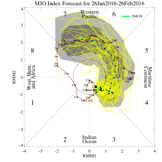 The updated Teleconnection Indices, MJO, Ensembles and other Hemispheric indictors are suggesting a somewhat volatile period may develop as February begins. The ECMWF EPS ( 50+ individual ensemble members) are suggesting a very impressive wave break from the North Pacific into the Polar Region which tends to lead to a lot of volatility and uncertainty regarding our sensible weather down stream where we live. The Arctic Oscillation is in a positive regime and that coincides with the zonal split flow and warmer temperatures we will experience the rest of January. The ensembles are indicating the AO may begin to crash, but there is uncertainty that it will return to a negative regime. The Pacific North American (PNA) is relaxing some, but is indicated to resume a rather strongly positive regime as February begins. That represents the building heights across Alaska and the Polar Regions we are seeing in the hour 174 and beyond via the ensembles. It is also noteworthy that the North Atlantic Oscillation (NAO) is not expected to swing into negative territory and the East Pacific Oscillation (EPO) only flirts with a negative reading versus the strongly negative phase we witnessed prior to the big East Coast Winter Storm last weekend. All the indicators suggest some of the coldest air of the season develops across Western and Central Canada and spills South into the Plains following a fairly significant Winter Storm mid next week. It will be interesting to watch the day to day changes via the various computer schemes as they attempt to grasp the Hemispheric changes that appear to be developing. Also, it is noteworthy to mention that the NOAA G-IV High Altitude Aircraft is in Honolulu/Pearl Harbor for a 2 month mission in support of the El Nino and Winter Storm potential and its impact on the Western United States. That valuable data will assist the model guidance as they fly around the Pacific Ocean sampling the upper air and dropping numerous dropsondes over the Pacific.
