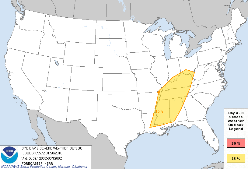 Beautiful mostly sunny and warm weather to end the last weekend of Jan 2016 across SE TX. Lots of sun and highs in the low to mid 70s through the weekend. The big weather story early next week with be a significant severe weather event across the Deep South. W TN, N MS, and N AL are in a 30% risk area for next Tuesday.