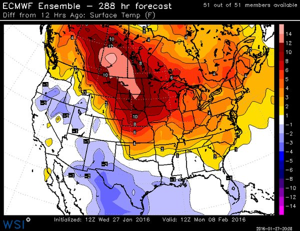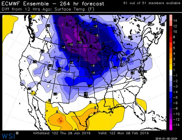 ECMWF EPS really struggling with the 11-15 day pattern. Yesterday's 12Z temperature changes compared to today's run.