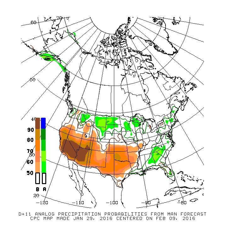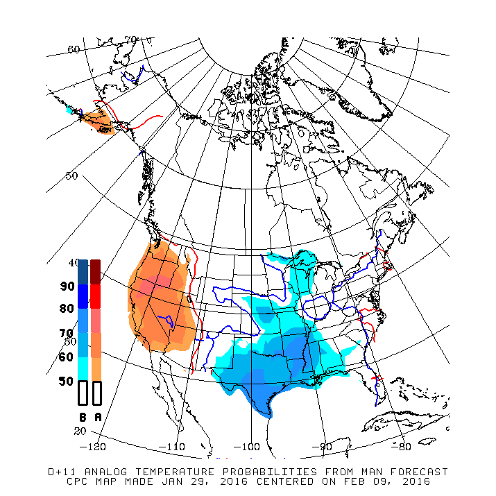 The Friday afternoon updated Climate Prediction Center Day 11+ Analogs have been issued. Looking like the 'coldest' air is situated over our Region and it looks dry.