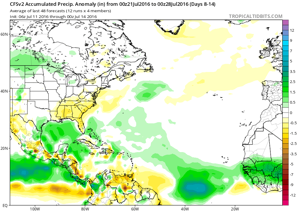 The Atmospheric pattern continues to look somewhat favorable for tropical development as a Convectively Coupled Kelvin Wave enhances thunderstorm development across the Atlantic. There is a vigorous tropical a couple of days from the Lesser Antilles and the ECMWF is suggesting an area of low pressure may attempt to organize early next week as it crosses Southern Florida and potentially nears the Southern Louisiana Coast.