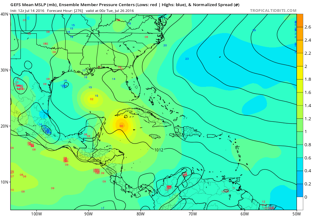 There are some indications that the SAL Outbreak may relax in about 10 to 14 days. The 12Z GEFS Ensemble Members are 'sniffing' potential Tropical Cyclone Genesis in the NW Caribbean as the dust abates and mean sea level pressures begin to lower. We will see.Ounce wrote:I guess that answers my question of how long it takes the atmosphere to get into a position to develop waves, when the dust stops coming off the Sahara...a week or two. Thanks.