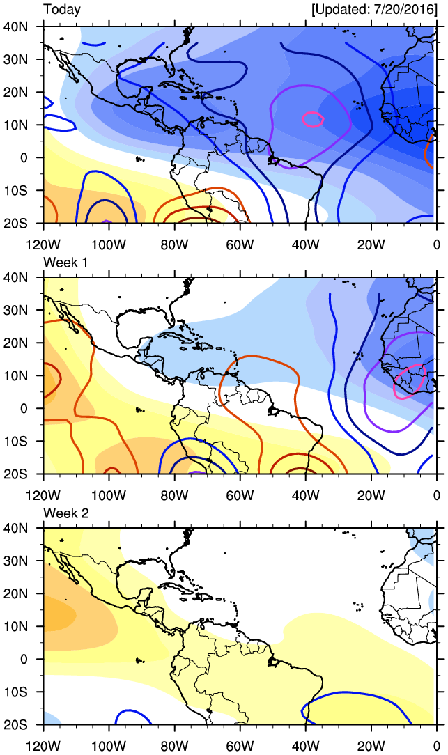 A rather vigorous monsoonal low is existing the West African Coast this morning and appears to have a low and mid level spin as well as convection associated with the wave. While the Saharan Arid Layer is still and inhibiting factor, we often see a strong tropical wave work in tandem to eventually ease the African Dust that is typical in July. While no development is expect as it crosses the Central Atlantic, condition may become a bit more conducive for develop in about a week to 10 days as it enter the Caribbean Sea. Some of the longer range models have been suggesting possible Tropical Cyclone Genesis in the NW Caribbean Sea/Southern/Western Gulf during the later days of July. We will continue to monitor the Tropics in the Atlantic Basin as it appears the Eastern Pacific parade of Tropical Cyclones is about to ease and shut off as colder sea surface temperatures from upwelling and a suppressed Madden Julian Oscillation settles over the Central and Eastern Pacific.