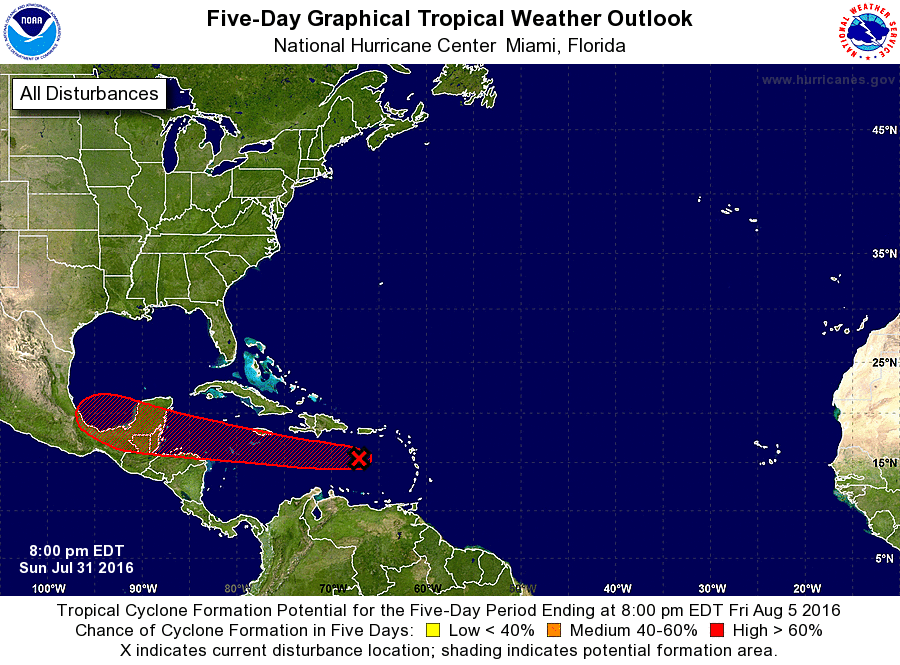 The National Hurricane Center increased chances of a Tropical Cyclone developing in the next 48 hours to 50% with the 8:00 PM EDT Outlook.