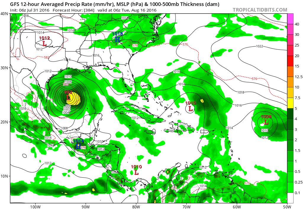 We began issuing advisories on this system yesterday. I think it's almost certain that it will develop into at least a tropical storm in the southwestern Gulf next Thursday or Friday. Nothing would prevent it from becoming a hurricane except time over the water. Right now, a track toward Tampico, MX looks more likely, but I certainly wouldn't rule out a Texas hurricane threat next Friday/Saturday.