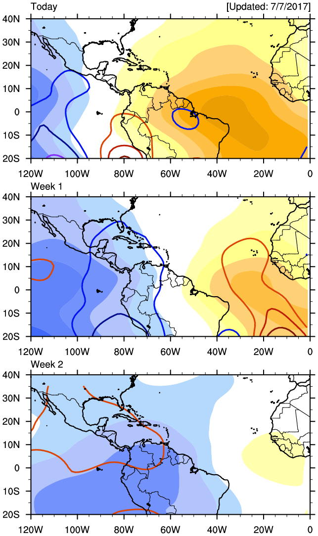 There are indications that a wet phase of the MJO as well as a CCKW that could enhance tropical thunderstorm development will enter the Western Atlantic Basin around 14th into the 21st of July. We are seeing some vigorous waves transition across Africa this season and have seen TC development that typically does not occur across the MDR this early in the Season. Perhaps it's a harbinger of things to come in the weeks ahead. The 'experts' have warned us that we could be an active and above average Hurricane Season. Don't let those Summer Doldrums lure you into a state of complacency.