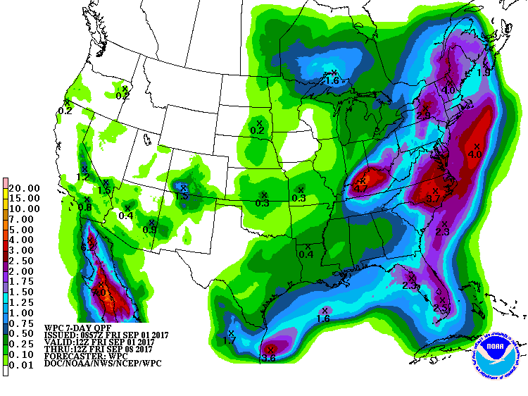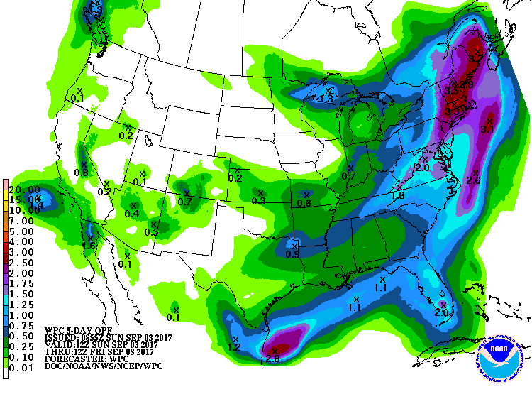 Many of us are out assisting our Neighbors in the massive cleanup effort after Harvey. The forecast is looking good with only a slight chance of heat of the day showers and thunderstorms possible today and tomorrow mainly along the Sea/Bay Breeze. Probably about a 20% chance at best. Tuesday we will likely see an increase in rain chances as the first rather strong early September Cold front arrives. This is about a week early according to our Local Climatology. Shower and some thunderstorms are possible as this rather fast moving front pushes in Tuesday evening and should be well offshore Wednesday morning. Cooler and drier air with its origin in Canada will drop day time highs to the low to 80's with night lows in the upper 50's to low 60's depending on where you live. Fingers crossed that the deep Eastern trough protects our Neighbors in the Bahamas, Florida and along the East Coast from any direct impact for Hurricane Irma.