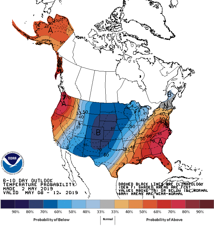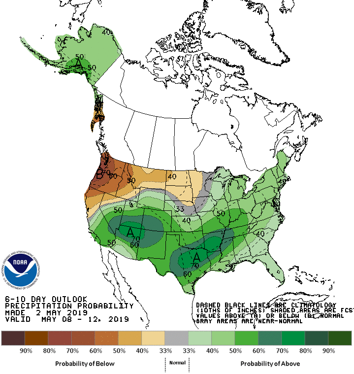 I don't see any change in the Medium or Longer Range that indicates our rain chances will disappear. The latest Update for the Climate Prediction Center suggests a deep trough situated across the Intermountain West into the Plains will keep a wet and somewhat cooler pattern due to clouds and rainfall well into mid May. We have a high latitude blocking regime established over the Artic into Greenland. The SE Ridge looks to remain in place leaving Texas in a general weakness with an active upper trough nearby.