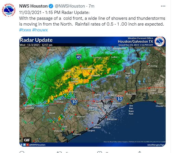The cold front stretches from GLS bay through the Houston area to