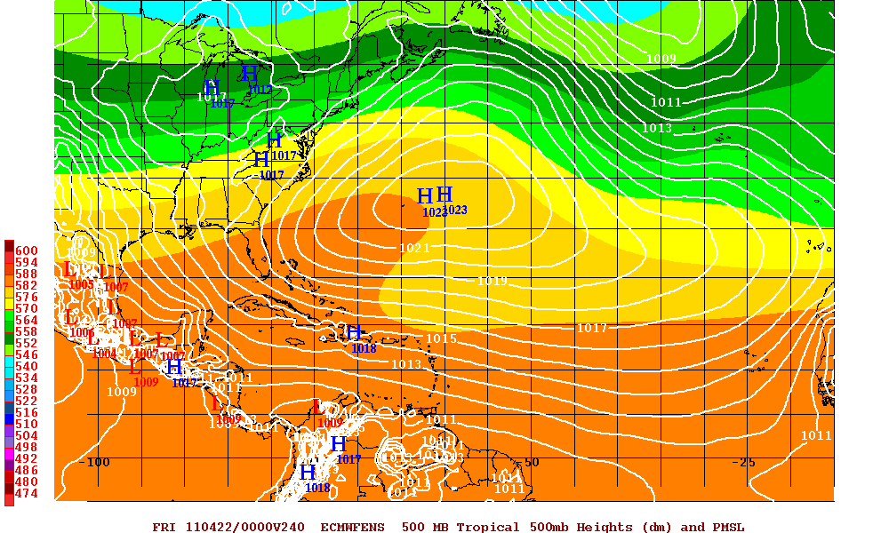 The pattern is suggestive of a high pressure area over the central U.S. with a trof in the eastern U.S. It's actually somewhat close to the 2010 pattern, but with a weaker ridge over the U.S. and a stronger Bermuda High. The effect would be to increase the risk of a landfall in the NE Caribbean, the Carolinas, and the western Gulf, as indicated in my graphic below. I don't see the heightened risk to Florida indicated in any of the analog years - UNLESS the Bermuda high is even stronger. Think 1999's Floyd turning north a few hundred miles farther west.
