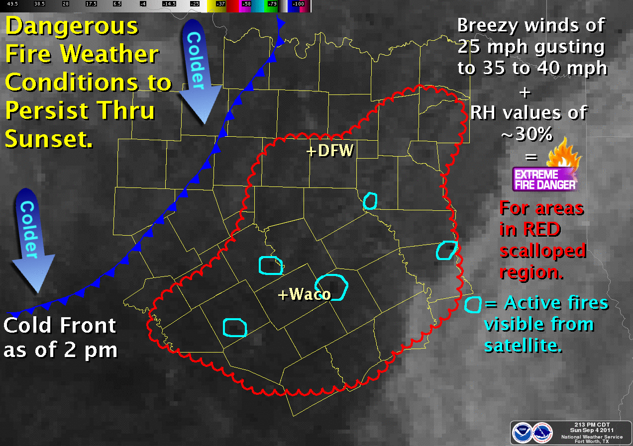Extremely dangerous fire weather conditions continue across the area today and will worsen on Monday. RH is still up a little today along with some cloud cover especially east of I-45 (the western edge of Lee’s cloud shield). However very strong winds are making conditions favorable for rapid fire growth should a fire start. Winds of 25-40mph will continue until mid evening and then weaken overnight, but remain in the 10-15mph range. Fire yesterday in NW Harris County near FM 1960 burned 50 acres and threatened several homes.