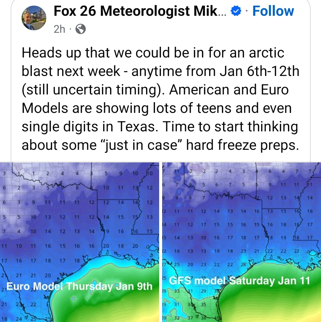 Right! I’m more concerned about temperatures that could burst pipes and do other damage. Been down that road, and don’t want to go through that again.Brazoriatx979 wrote: ↑Sun Dec 29, 2024 6:42 amYes, but don't take that as gospel. It's going to change 1,000 times