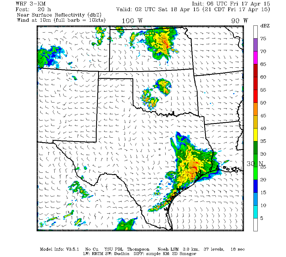 The 12Z Texas Tech WRF has a good handle on the storms developing to our West and suggests training storms will again linger well into the early morning hours after the big Mesoscale Convective System rolls East across the I-10 Corridor. It is a bit worrisome to see a yet another possible MCS developing tomorrow morning to our West suggesting another round of severe weather with very heavy rainfall approaching. Stay Tuned and follow our Texas Weather Board Facebook and twitter social media feeds for all the up to date information!
