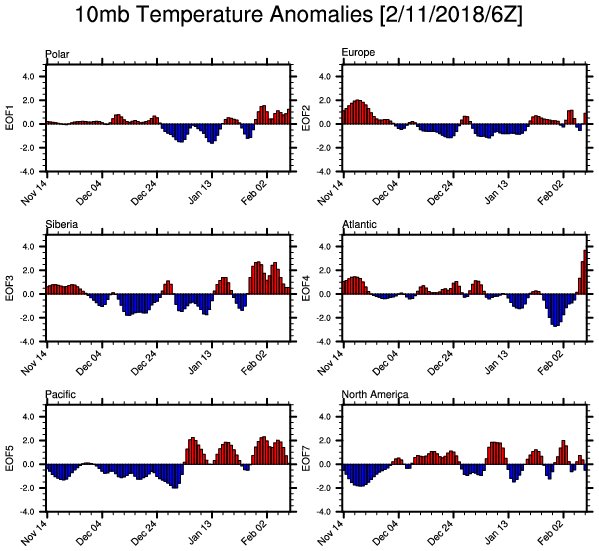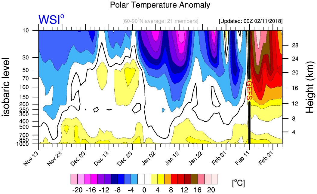 Here's what the vertical cross-section of temperature anomalies by time looks like; Note the GEFS forecast of anomalous warm temperatures propagating down from the stratosphere towards the troposphere.