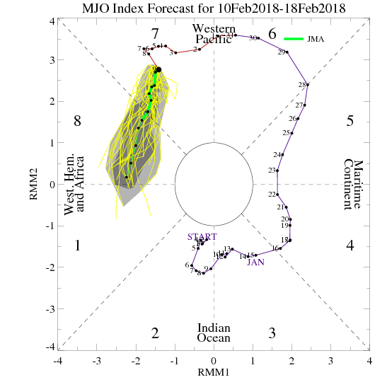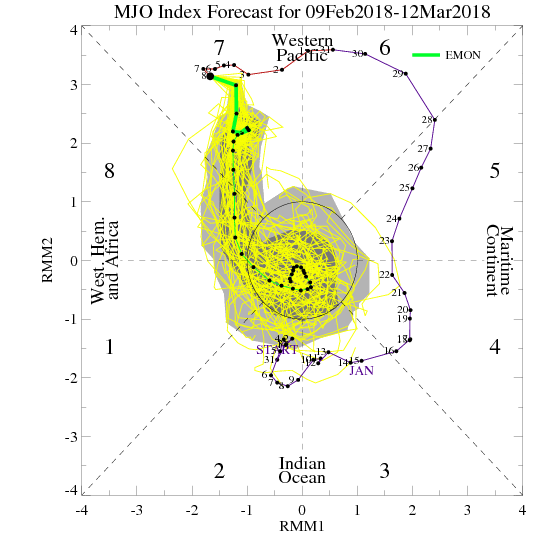 Now for the potential impacts regarding our sensible weather. The overnight Ensembles are still attempting to resolve this SSW Event, but as of this morning we see Ridging off the West and East Coasts as the Greenland Block (-NAO) becomes established. As the Polar Vortex is crushed near the Hudson Bay that has been present all late Fall/Winter Season, we see cold air in Canada and across Asia build and a general trough into the Great Basin/Great Plains versus the consistent upper trough pattern from Hudson Bay in Canada back to the SW across the Plains. That subtle shift in orientation of the Upper Trough may have impacts on our weather in the Long Range. I believe we will see a continuation of the roller coaster pattern with additional Arctic/Polar Air advancing S into Texas as well as moisture. The Madden Julian Oscillation (MJO) currently stalled in Phase 7 looks to migrate into Phase 8 which suggests a wetter pattern for North America. While I do not see extremely bitter cold air coming our way, I do see multiple shots of cold air entering Texas that could bring rounds of rain to wintry mischief as February ends and March begins. All that said...there will remain a lot of volatility in the various computer model schemes and the impacts of this SSW Event are not yet known for our side of the Globe. We will continue to monitor carefully as the days unfold the remainder of the month.